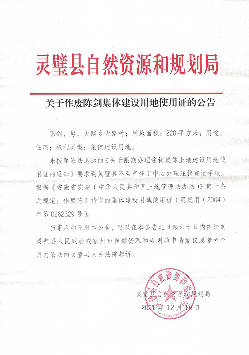 灵璧县不动产登记中心界址公告 (灵璧县建灵投资管理有限公司)