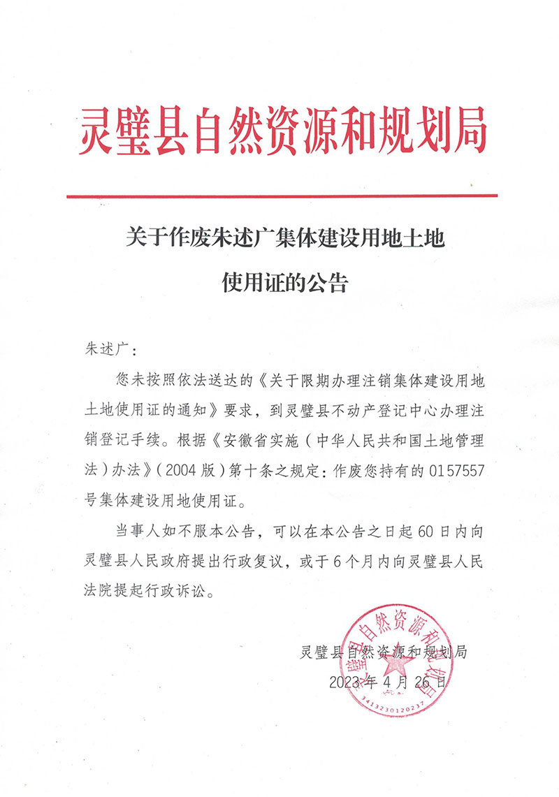 关于作废朱述广集体建设用地土地使用证的公告