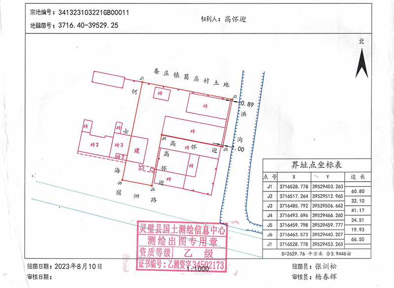 本宗地面积为2629.76平方米,(见宗图)。四至:(见表) 北:(J1-J2) 界址点连线外邻娄庄镇葛店村土地; 东: (J2-J3) 界址点连线外邻洪沟; 南: (J3-J4) 界址点连线外邻高怀迎; 东: (J4-J5) 界址点连线外邻高怀迎; 南:(J5-J6)界址点连线外邻宿泗路; 西:(J6-J1)界址点连线外邻何士海。