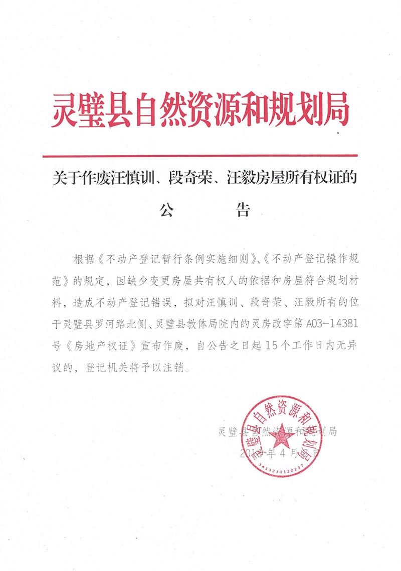 关于作废汪慎训、段奇荣、汪毅房所有权证的公告