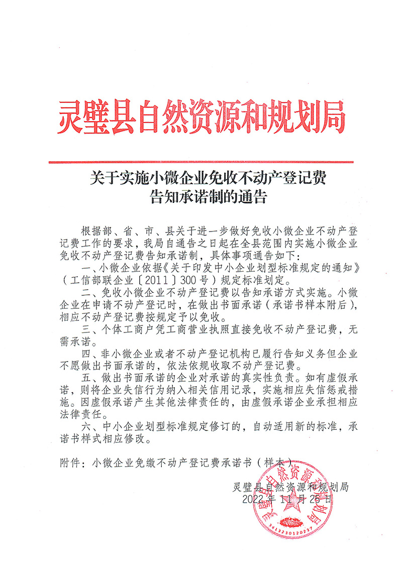 关于实施小微企业免收不动产登记费告知承诺制的通告