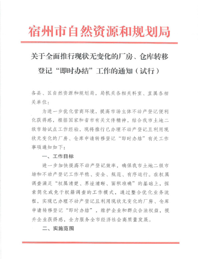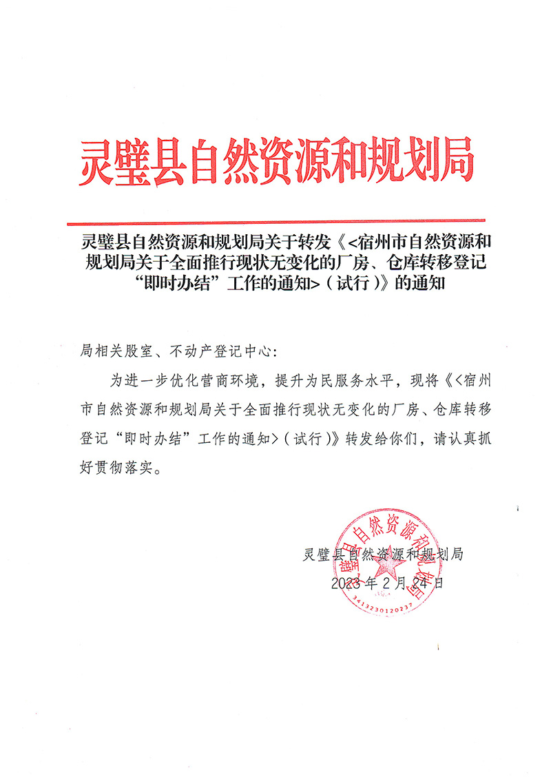 关于转发《宿州市自然资源和规划局关于全面推行现状无变化的厂房、仓库转移登记“即时办结 ”工作的通知》