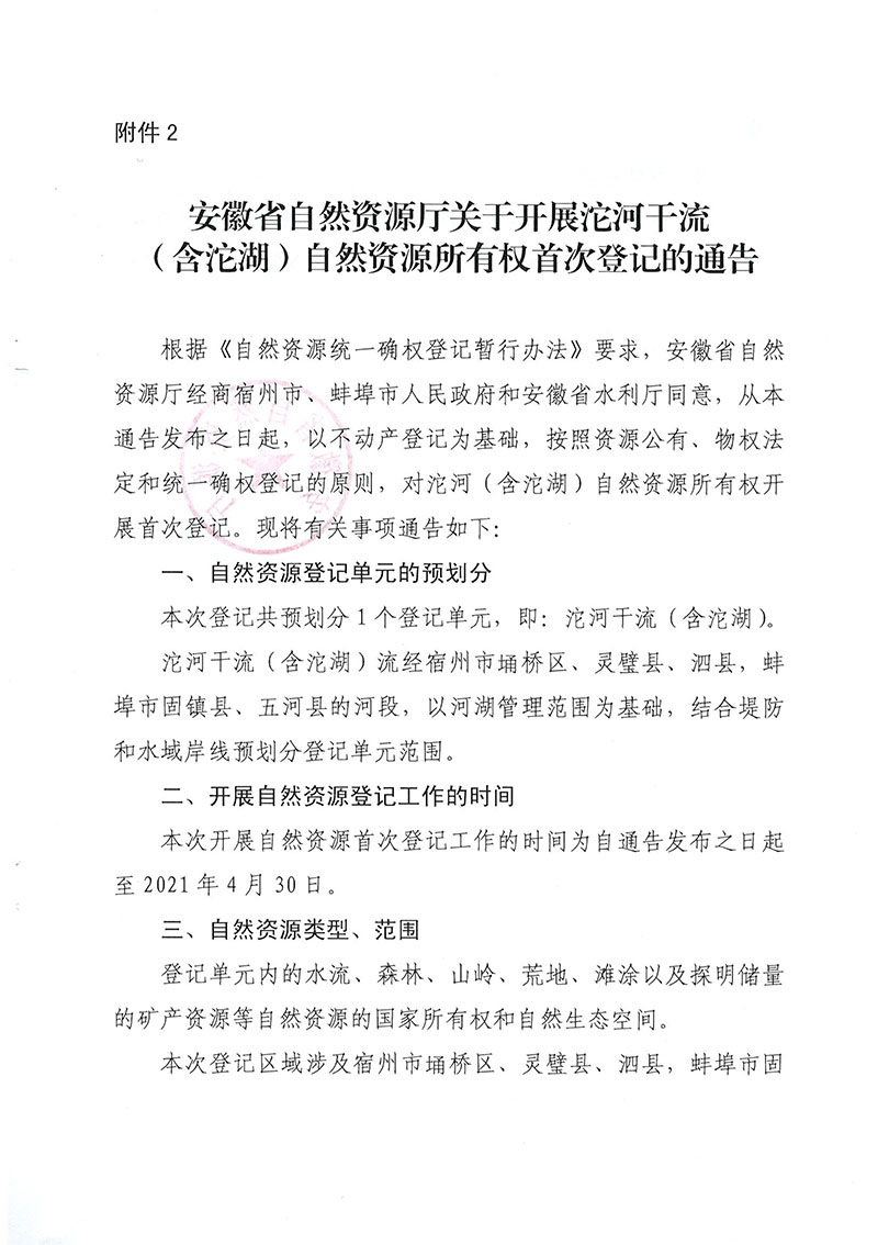 安徽省自然资源厅关于开展沱河干流(含沱河)自然资源所有权首次登记的通告