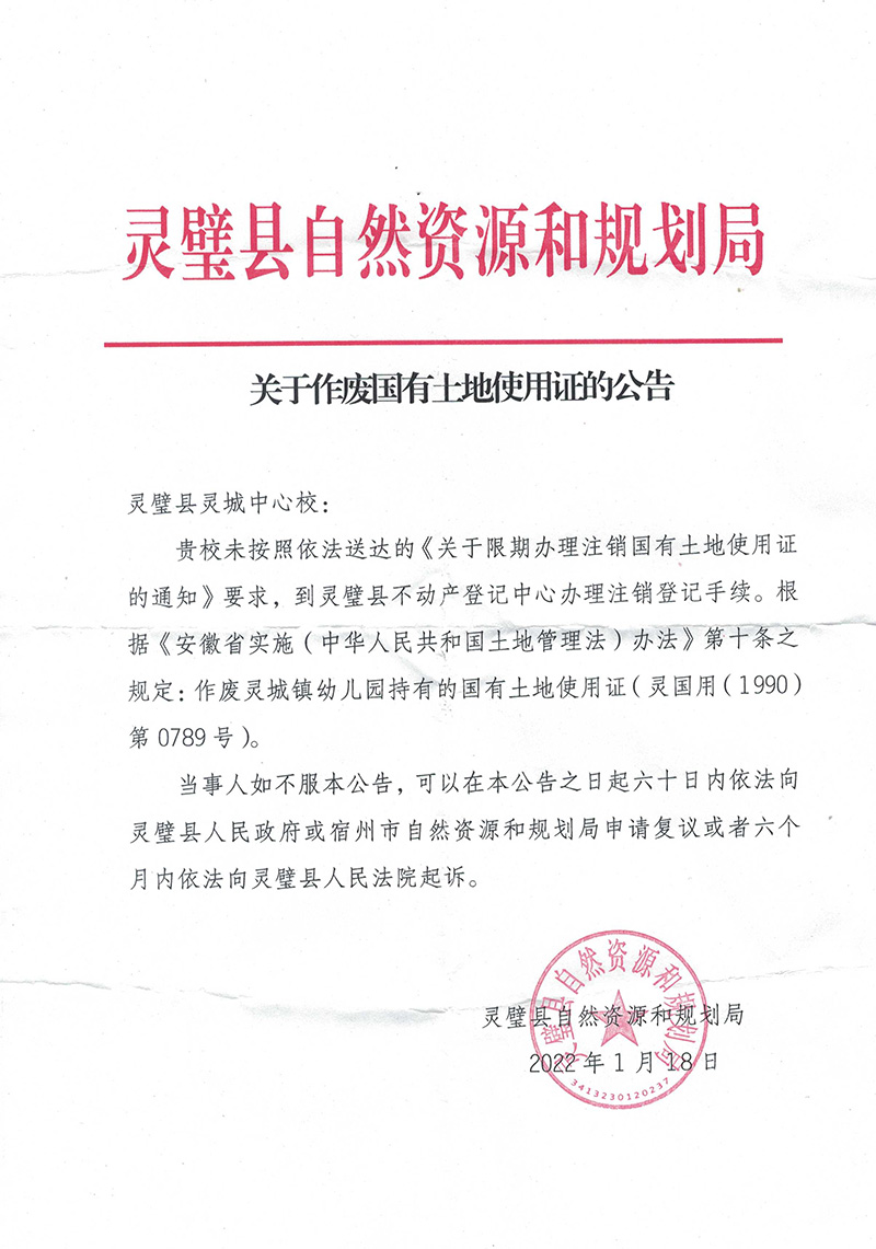 关于作废国有土地使用证的公告(灵城镇幼儿园)