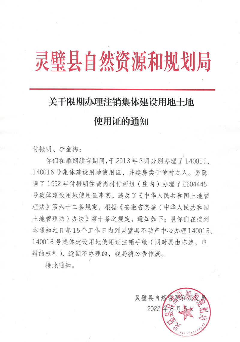 关于限期办理注销集体建设用地土地使用证的通知(付振明、李金梅)