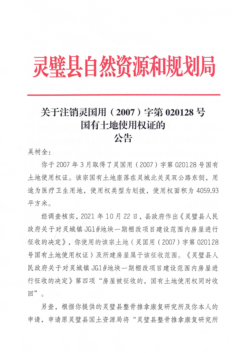 关于注销灵国用(2007)字第020128号国有土地使用权证的公告