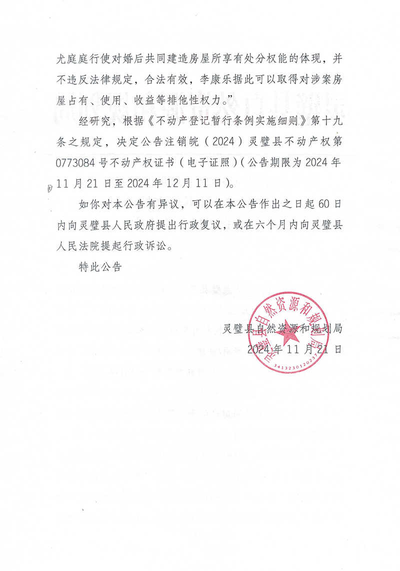 关于注销皖(2024)灵璧县不动产权第0773084号不动产权证书(电子证照)的决定