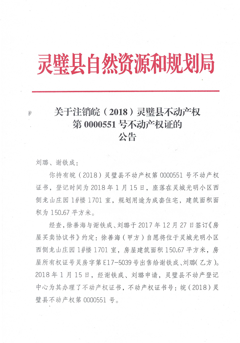 关于作废皖(2018)灵璧县不动产权第0000551号不动产权证的公告