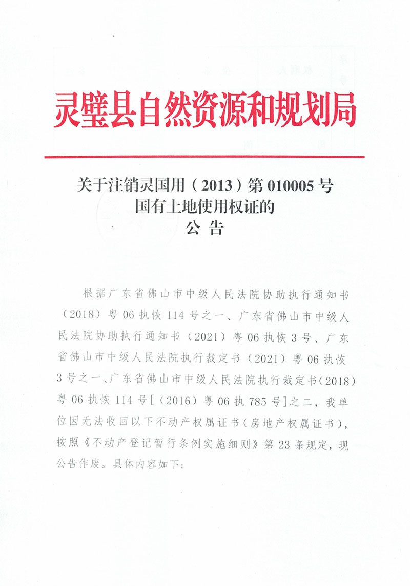 关于注销灵国用(2013)第010005号国有土地使用权证的公告