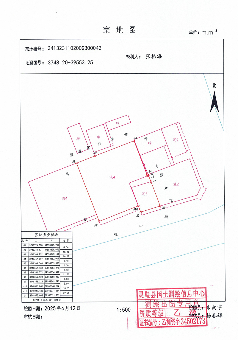 本宗地面积为781平方米,(见宗图)。四至:(见表) 北:(J1-J3) 界址点连线外邻张孟军、张家领、; 东: (J3-J6) 界址点连线外邻仲飞; 东: (J6-J8) 界址点连线外邻张孝飞; 南: (J8-J11) 界址点连线外邻砚山街; 西:(J11-J1)界址点连线外邻马云。 灵璧县不动产登记中心 2025年6月12日 (供稿人:赵运权)