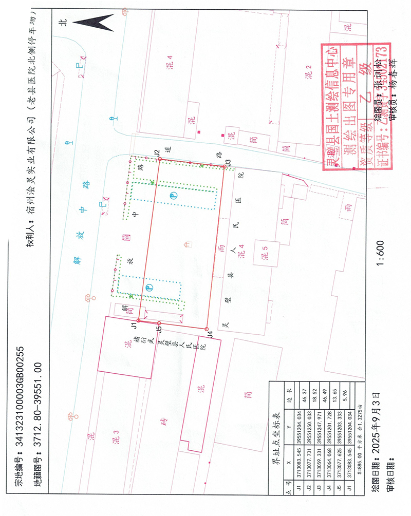 注: 北:(J1-J2) 界址点连线外邻解放中路 东: (J2-J3) 界址点连线外邻道路 南: (J3-J4) 界址点连线外邻灵璧县人民医院 西: (J4-J1) 界址点连线外邻灵璧县人民医院和诸衍武 附:本宗地面积为885平方米,(见宗地图),四至:(见表)。