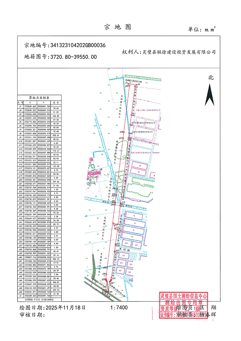 本宗地面积为92046平方米,(见宗图)。四至:(见表) 北:(J1-J2) 界址点连线外邻灵城镇三张社区土地; 东: (J2-J4-J5-J7-J29) 界址点连线外邻灵城镇三张社区土地、宿州佰晟机械科技有限责任公司、灵璧米豆机械制造有限公司; 南: (J29-J31) 界址点连线外邻盐洛高速; 西: (J31-J35-J49-J1) 界址点连线外邻杨疃镇红光村土地、灵城镇三张社区土地。 灵璧县不动产登记中心 2025年11月20日 (供稿人:赵运权)