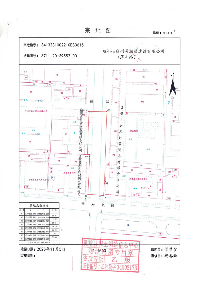 本宗地面积为3935平方米,(见宗图)。四至:(见表) 北:(J1-J2) 界址点连线外邻道路; 东: (J2-J4) 界址点连线外邻灵璧县众志时装贸易有限责任公司; 南: (J4-J5) 界址点连线外邻奇石大道; 西: (J5-J6-J7-J1) 界址点连线外邻灵璧县惠民农村供水有限公司、宿州市升宏塑业有限责任公司。 灵璧县不动产登记中心 2025年12月15日