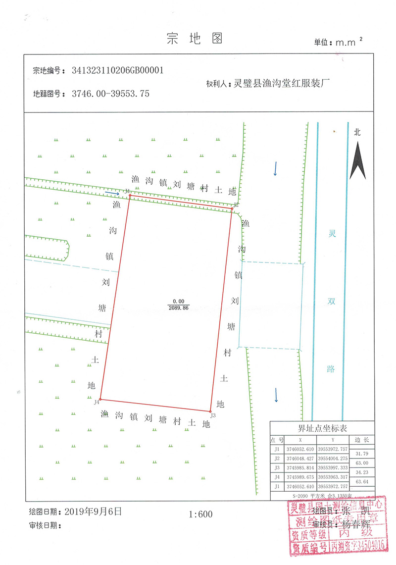 本宗地面积为2090平方米,(见宗图)。四至:(见表) 北:(J1—J2) 界址点连线外至渔沟镇刘塘村土地。 东: (J2-J3) 界址点连线外至渔沟镇刘塘村土地。 南: (J3-J4) 界址点连线外至渔沟镇刘塘村土地。 西: (J4-J1) 界址点连线外至渔沟镇刘塘村土地。 灵璧县不动产登记中心 2019年10月14日 (供稿:王勉)
