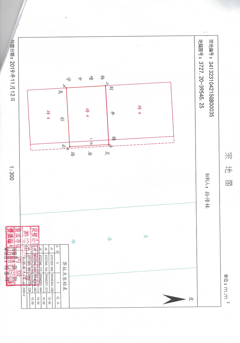本宗地面积为150.00平方米,(见宗图)。四至:(见表) 北:(J1—J2) 界址点墙外至刘井楼。 东: (J2-J3) 界址点墙外至灵房路。 南: (J3-J4) 界址点墙中至吴彩云。 西: (J4-J1) 界址点墙外至杨疃中学。 灵璧县不动产登记中心 2019年11月17日 (供稿:王勉)
