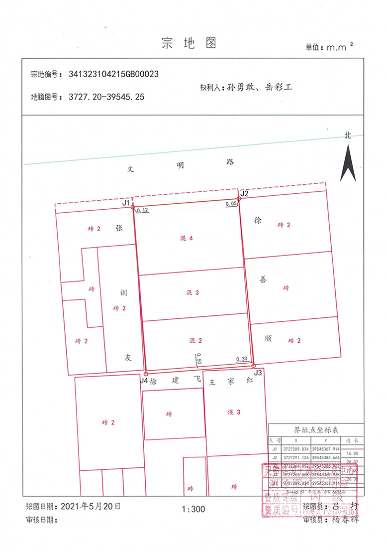 本宗地面积为446.51平方米,(见宗图)。四至:(见表) 北:(J1—J2) 界址点连线外至文明路; 东: (J2-J3) 界址点连线外至徐善顺; 南: (J3-J4) 界址点连线外至王家红、徐建飞; 西: (J4-J1) 界址点连线外至张训友。 灵璧县不动产登记中心 2021年5月20日 (供稿:王勉)