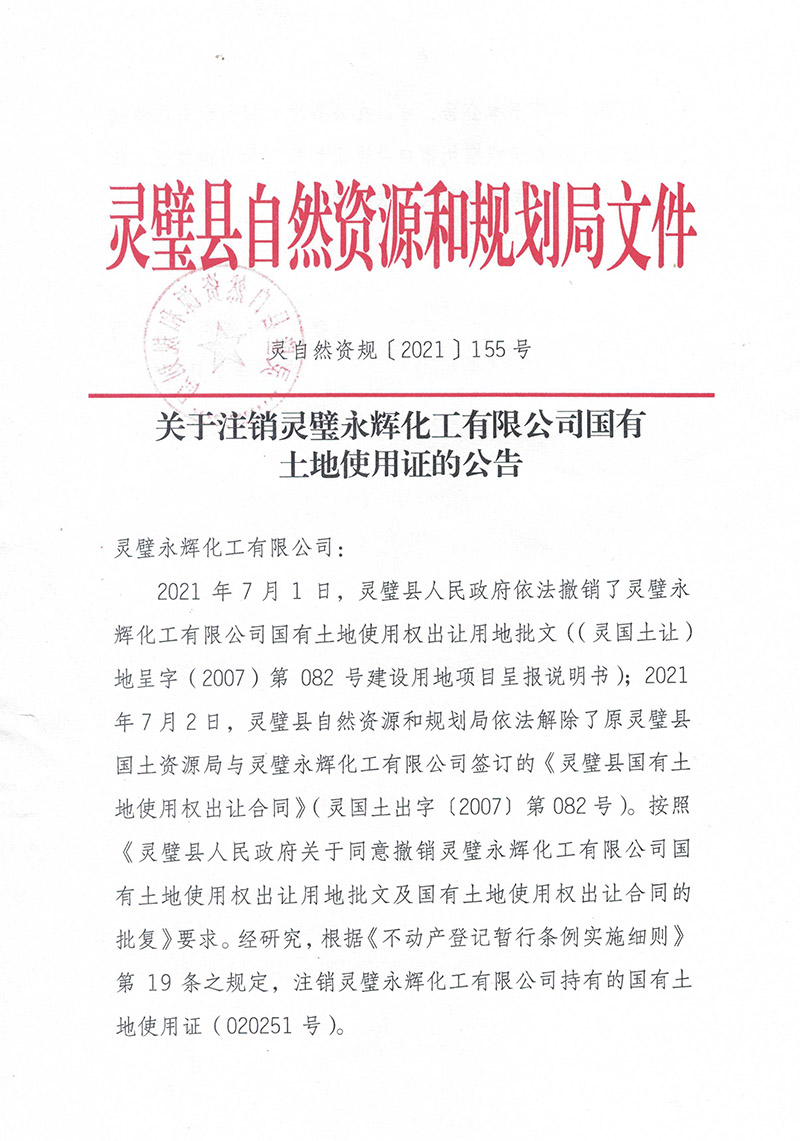 关于注销灵璧永辉化工有限公司国有土地使用证的公告