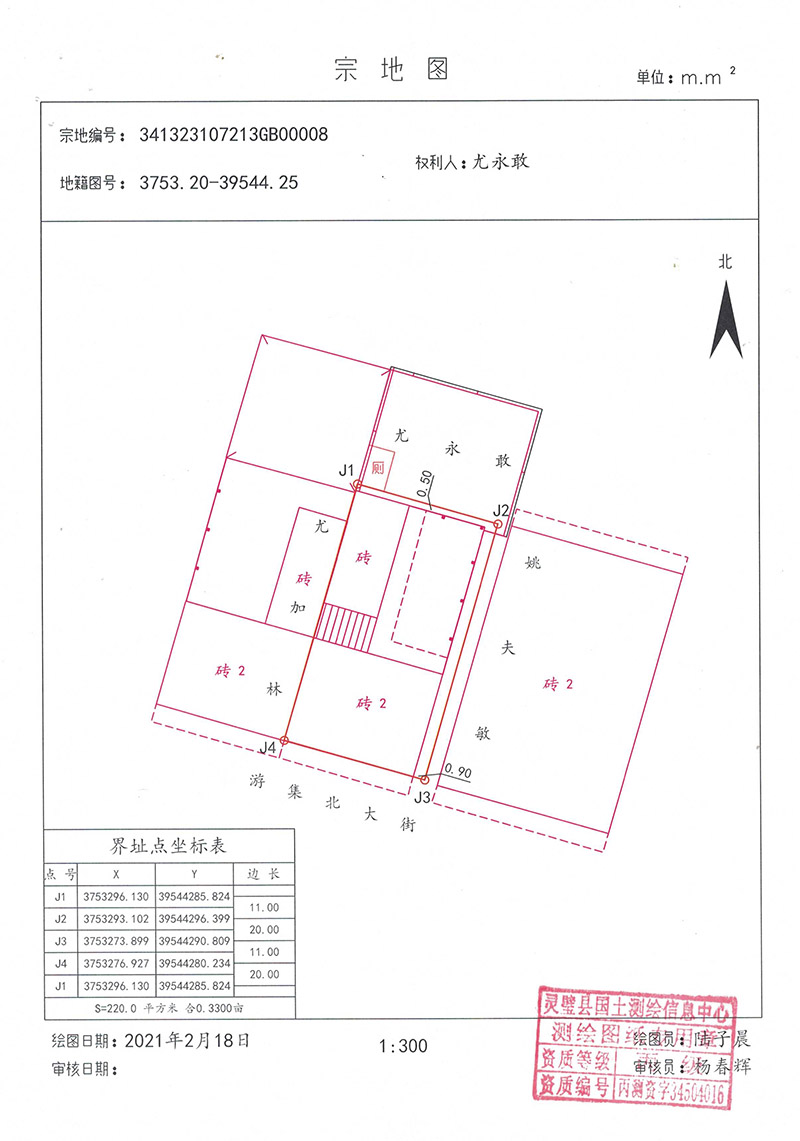 本宗地面积为220.00平方米,(见宗图)。四至:(见表) 北:(J1—J2) 界址点连线外至尤永敢; 东: (J2-J3) 界址点连线外至姚夫敏; 南: (J3-J4) 界址点连线外至游集北大街; 西: (J4-J1) 界址点连线外至尤加林。