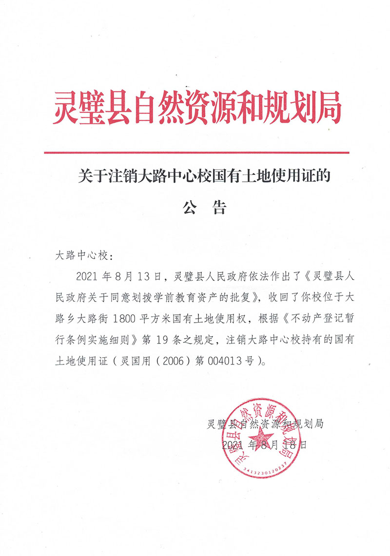 关于注销大路中心校国有土地使用证的公告