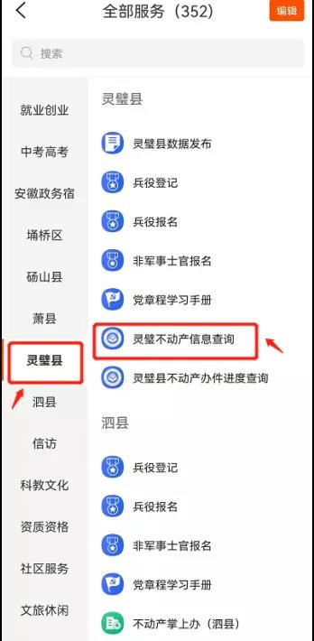 3.进入“全部服务”页面后,选择灵璧县点击“灵璧不动产信息查询”。
