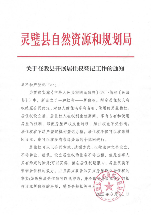 关于在我县开展居住权登记工作的通知