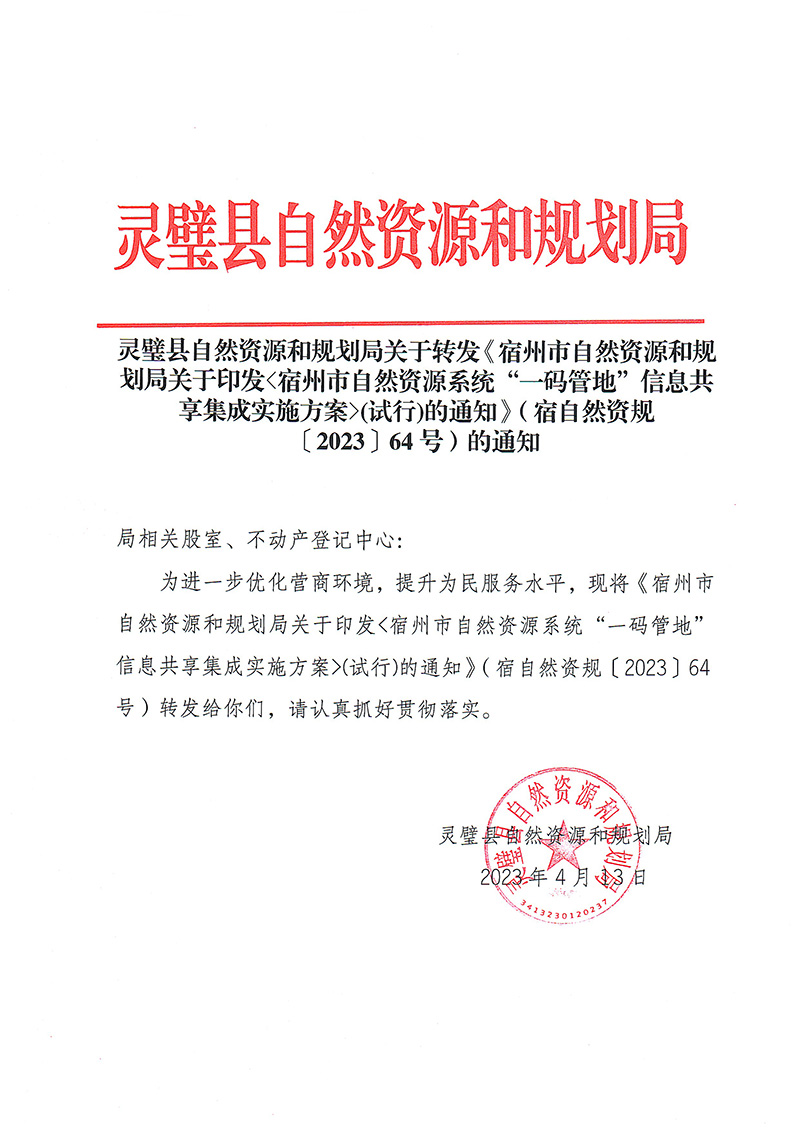 关于印发《宿州市自然资源系统“一码管地”信息共享集成实施方案》(试行)的通知